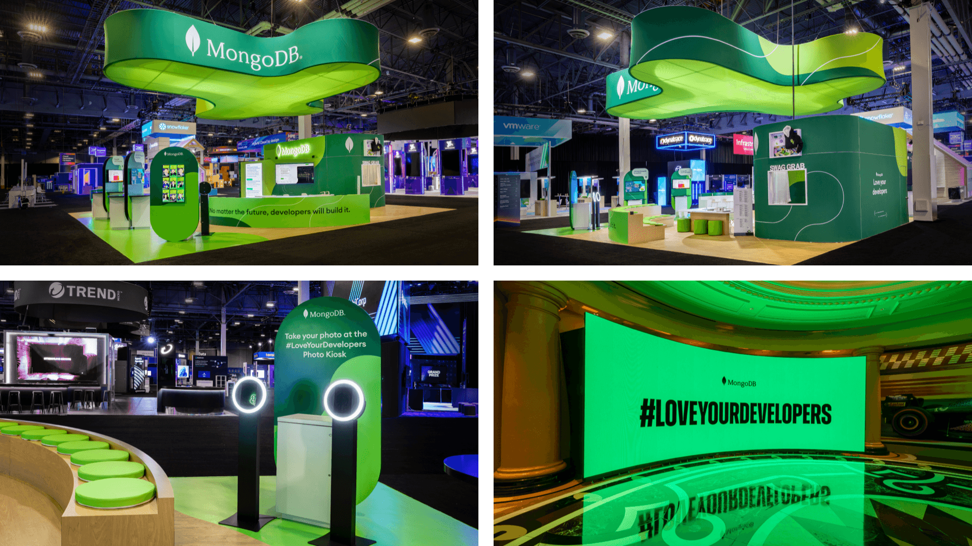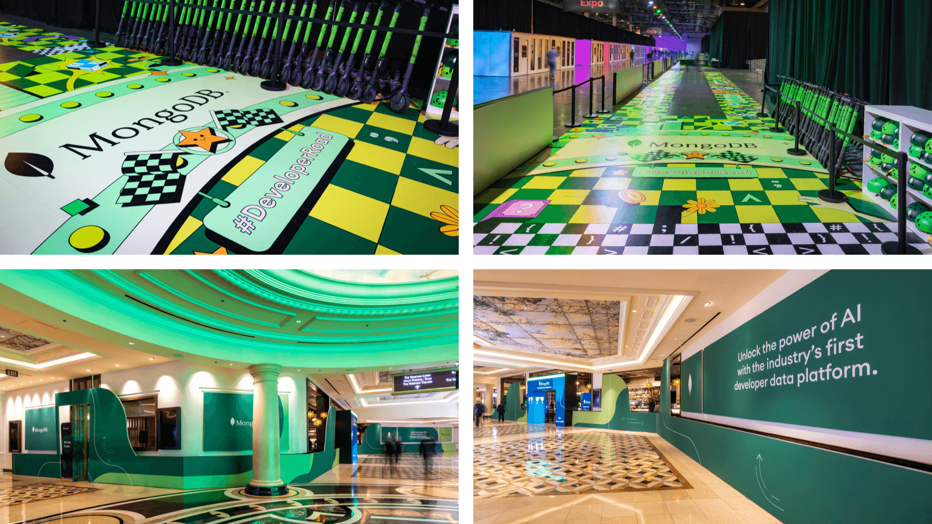 At AWS re:Invent, MongoDB left a memorable impression by captivating attendees with their striking design elements across multiple venues. The 30'x30' expo booth had innovative swag, demos, and a digital photo booth for interactive engagement. Additionally, the Developer Highway had floor graphics, custom-wrapped scooters, an in-hotel LED wall, and an activation at the Sugarcane Restaurant that transitioned for day-to-night events. MongoDB's strategic and visually cohesive approach ensured an unforgettable brand experience, reinforcing its industry leadership.